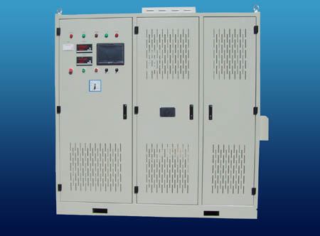 变频电源部分内主要布置有整流滤波器、中频逆变器、滤波电抗器、风冷散热器、直流母线过压吸收单元等组件。变频电源柜体内装设4组性能一致,相互独立运行的整流滤波单元及逆变器单元,各逆变器单元输出通过中频输出变压器合成后输出100KW功率。这样每个逆变单元容量相对较小,而且当一个单元发生故障时,只需要退出该单元,不会影响整套设备的运行。各逆变单元具有缺相、过流、过热等保护功能。柜顶布置有散热风机。